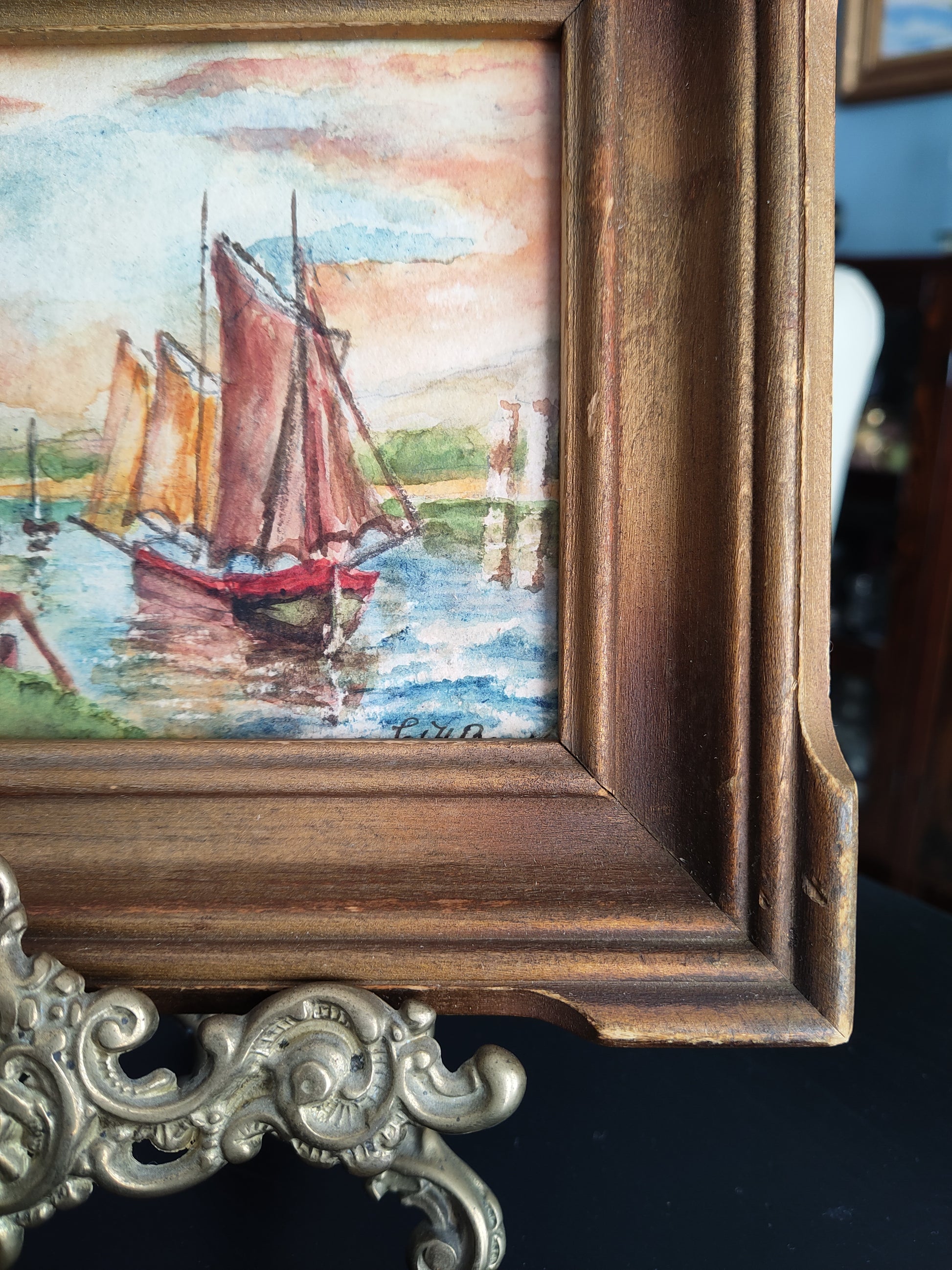I wasn't able to find any info on Charlotte H. Bradley, but this work's cozy harbour scene, rich vintage framing, and poem on back leave plenty to admire. I think it's well done in many ways; smart shading in the water and greenery, the serene dawn (dusk?) sky, and the rendering of the ships' reflections. I also love seeing tiny brushstrokes on small representational pieces like this one. Too cute. Overall I find it very peaceful and a sweet 1940's piece that'll bring charm to any space.