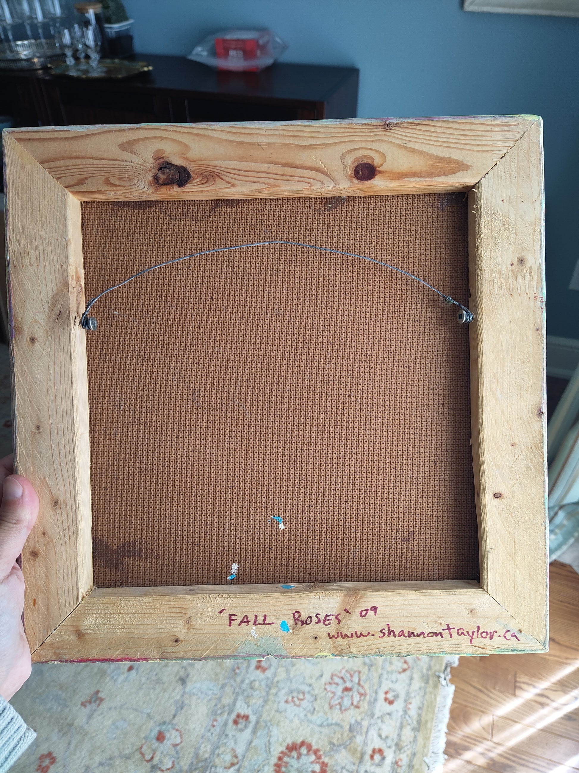 Close up you can see it's careful layers and shapes, and it's interesting to fit this in to the line of her work and how she currently layers colours. It's done on board and has hanging fixtures on the back.